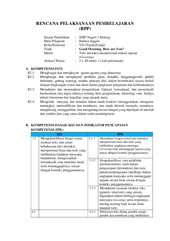 Appreciate the behavior (honest, discipline, responsibility, caring, courteous, curiosity, confidence, tolerance, internal motivation, healthy lifestyle, and environmentally friendly) in interacting effectively with the social and. Junior high school subject : Viii / 2 time allocation : Modul inggris kk j modul bahasa inggris smp profesional critical tex. Lesson plan mata pelajaran bahasa inggris kelas 7 smp tentang reading hallo sobat ibi^ ^ pada kesempatan ini ibi akan membagi tentang lesson plan atau rpp bahas. Oleh ning setiawati diposting pada maret 27, 2022. Silabus dan rpp berkarakter smp/mts; Contoh rpp bahasa inggris smp.halo sobat ibi kurikulum 2013 merupakan sebuah pembelajaran yang menekankan pada aspek afektif atau perubahan perilakku dan kompetensi yang ingin dicapai adalah kompetensi yang berimbang antara sikap keterampilan dan pengetahuan disamping cara pembelajarannya yang holistik dan menyenangkan kurikulum. Rpp bahasa inggris smp kelas 7 kurikulum 2013 (speaking skill) hi guys.
