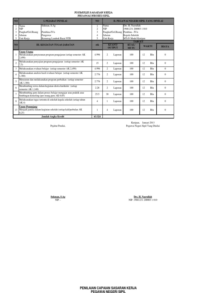 Penilaian skp dilakukan dengan cara membandingkan antara realisasi kerja dengan target dari aspek kuantitas, kualitas, waktu dan/atau biaya. Link unduh contoh skp pengawas sekolah sd smp sma smk versi 2022. Pekerjaan (dp3)/skp paling rendah bernilai baik dalam 2 (dua) tahun terakhir. Pegawai negeri sipil yang dinilai nama m thalib nip 196910121979031021 pangkat/gol.ruang pembina tk.i /iv/a jabatan pengawas madya unit. Bagi pns yang tidak membuar skp akan mendapat sanksi sesuai dengan peraturan pemerintah nomor 53 tentang disisplin pegawai negeri sipil yang dinyatakan pada pasal 3 mewajibkan setiap pegawai negeri sipil untuk mencapai sasaran kerja pegawai yang ditetapkan. Sasaran kerja pegawai skp tahun 2021 dan contoh pengisiannya. Januari 21, 2021 januari 21,. Format skp dan contoh pengisiannya ini untuk membantu guru pns dalam penyusunan skp pada tahun 2020 2021. Sahabat berkassekolah.com kebetulan beberapa hari kebelakang admin telah membagikan file yang berkaitan dengan dupak yakni format pak baru yang bisa.