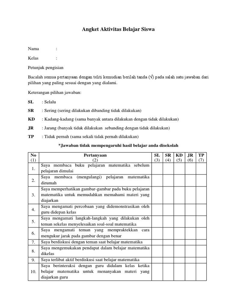 Contoh soal angket tentang kegiatan pramuka. Saya menyelesaikan tugas yang diberikan untuk memahami konsep yang diberikan. Sikap terhadap matematika mencakup aspek kognisi, afeksi dan konasi. Perhatian dalam belajar kesiapan kelengkapan dalam buku dan. Nama siswa kelas pemerintah provinsi sumatera Saya mengajak teman untuk tidak belajar kelompok. Mekanisme pengisian angket dapat dilakukan secara konvensional melalu media fisik maupun digital, tergantung dari kesiapan siswa itu sendiri. Kepada yth bpk ibu orang tua siswa/ wali sman 5 kota serang. Alasannya karena angket dalam arti.