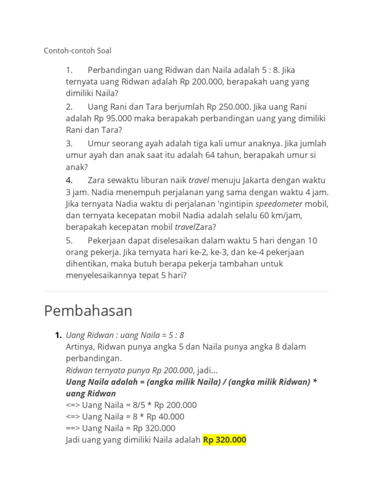 Ada 4 buah mesin jahit yang dapat menyelesaikan pekerjaan kain selama 30 jam. Contoh soal dan pembahasan jawaban perbandingan dan skala, materi ulangan harian matematika kelas 7 smp mencakup perbandingan senilai, perbandingan berbalik nilai dan menentukan jarak pada peta berdasarkan skala yang diberikan. 9142020 perbandingan uang tono dan toni adalah 4. Apakah perbedaan antara uang kartal dan uang giral? Contoh soal 6 (un 2018) perbandingan uang verrel, saffa dan mahesa 4 : Buat kamu yang lagi belajar tentang perbandingan, bisa latihan di sini ya. Berikut masih ada beberapa soal yang bisa untuk latihan. Dari banyaknya jenis perbandingan, bentuk yang sering muncul. Silahkan kerjakan soal di bawah ini dengan benar!