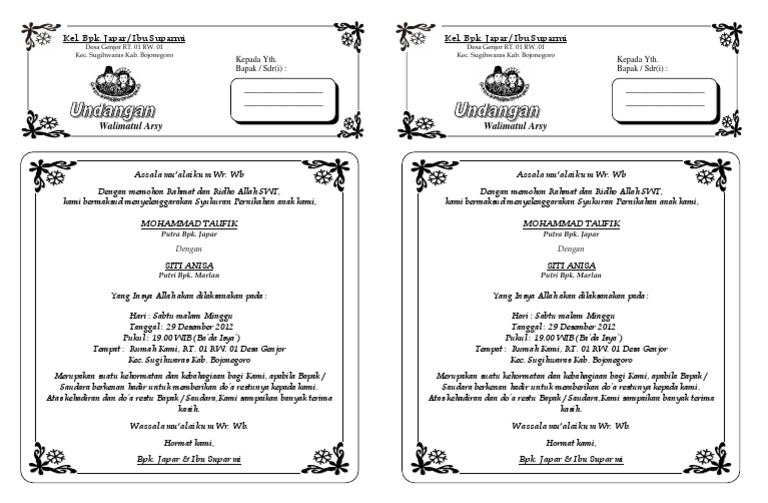 Misalnya saja melalui panggilan telepon ataupun chatting. Bismillahirohmanirrohim ( pakai huruf arab ) assalamu’alaikum warahmatullahhi wabarakatuh. Contoh undangan kenduri format word contoh undangan kenduri layout phrase. Untuk mendownload file undangan ini, pilih file kemudian pilih download as lalu pilih jenis format dokumen yang akan kamu download. Basa krama lah yang digunakan untuk isi surat undangan pernikahan. Download contoh undangan akad nikah doc terbaru download template download format surat lain: Format bagi 2 atau dua kolom dengan kertas hvs untuk keperluan undangan fotocopy yang semoga bermanfaat untuk anda terutama yang akan melangsungkan pernikahan. Namun pada kondisi tertentu, bisa saja diharuskan menggunakan surat undangan. Sebelumnya kami juga sudah membuat berbagai jenis file yang siapa tau teman teman membutuhkannya, dan berikut.