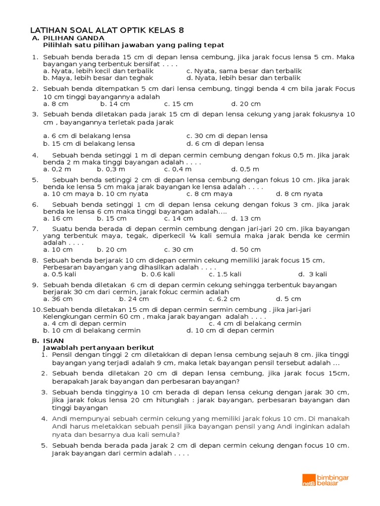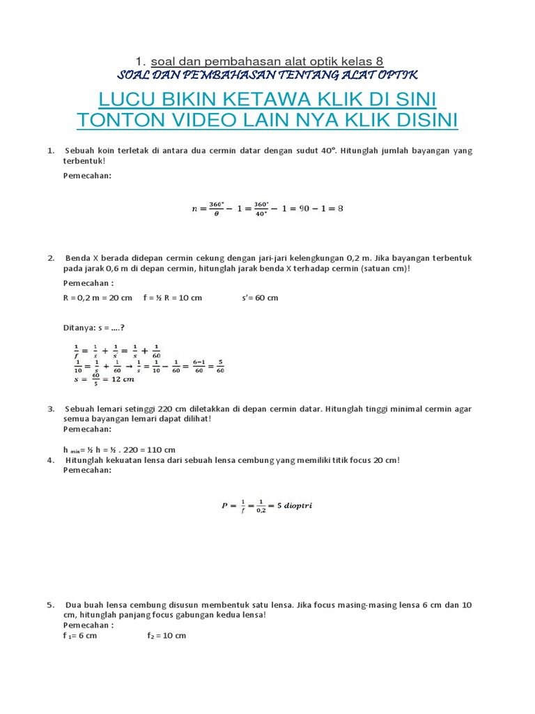 Ati membeli 4 pasang sepatu seharga rp 320.000,00. Soal dan pembahasan cahaya kelas 8 smp. Soal yang akan dibahas adalah soal pilihan ganda berjumlah 10 butir dan essai berjumlah 7 butir. P = 100/ sn + 100/pp. Al hikma rumus rumus fisika kelas viii smp. Rumus lensa cembung dan lensa cekung rumushitung com. Contoh soal dan jawaban aplikasi serat optik. Jika benda diletakkan pada pertengahan di antara titik api dan permukaan cermin cekung, maka bayangan yang terbentuk : 0 response to soal smp kelas 8 semester 2 tentang cahaya dan optik part ii post a comment.