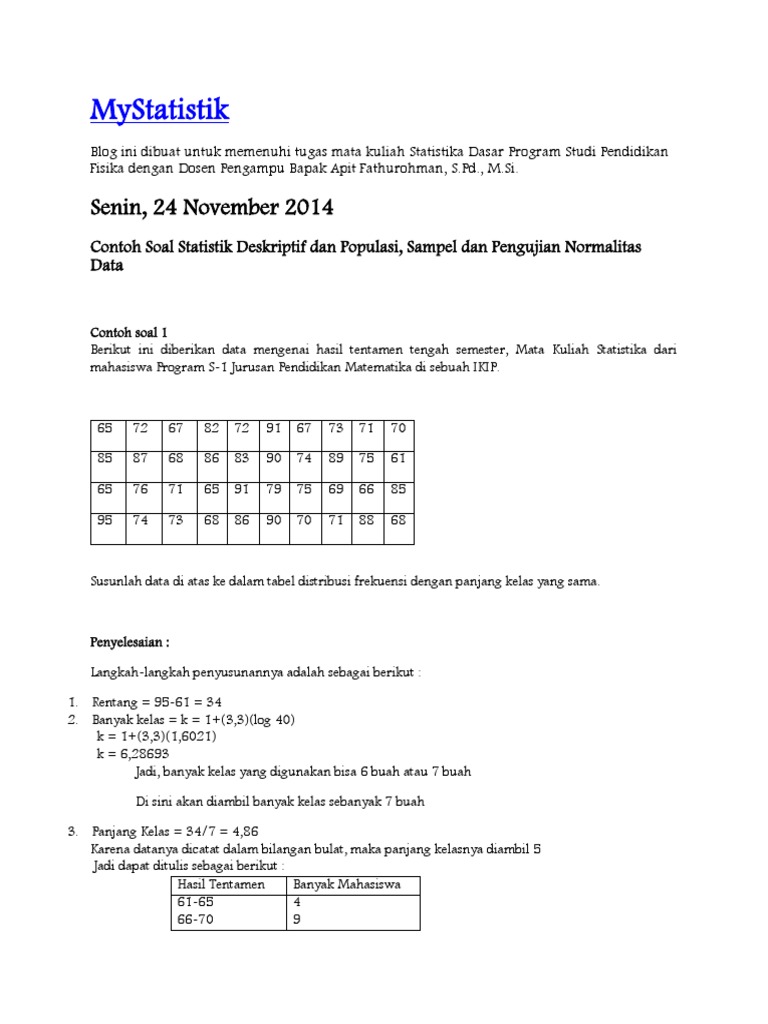 Contoh populasi dan sampel dalam statistika matematika. 3 contoh populasi dan sampelnya nasi from kitabelajar.github.io download buku matematika kelas 6 quadra pdf download lagu di resso ke musik download contoh program kerja organisasi efek samping money amulet download buku matematika kelas 6 seri hots download ppt iman kepada kitab. Jika kamu mencari artikel contoh populasi dan sampel dalam statistika matematika terlengkap, berarti kamu sudah berada di web yang benar. Salah satu dari metode tersebut dikenal dengan metode momen (method of moments estimation, mme).metode ini merupakan sebuah prosedur yang sangat sederhana untuk mencari estimator atau penduga bagi satu atau lebih parameter populasi. Sedangkan populasi yang memiliki klaster saja karena peneliti telah membatasi pada strata tertentu. Tahukah kalian definisi dari kedua istilah tersebut? Istilah populasi dan sampel identik dengan statistik atau bisa dikatakan juga lebih familiar dalam riset kuantitatif. Contoh soal statistik deskriptif dan populasi sampel dan pengujian normalitas data contoh soal 1 berikut ini diberikan data mengenai hasil tentamen tengah semester mata kuliah statistika dari mahasiswa program s 1 jurusan pendidikan matematika di sebuah ikip. Pengrajin rotan, petani yang memiliki sawah dan sma di perkotaan.