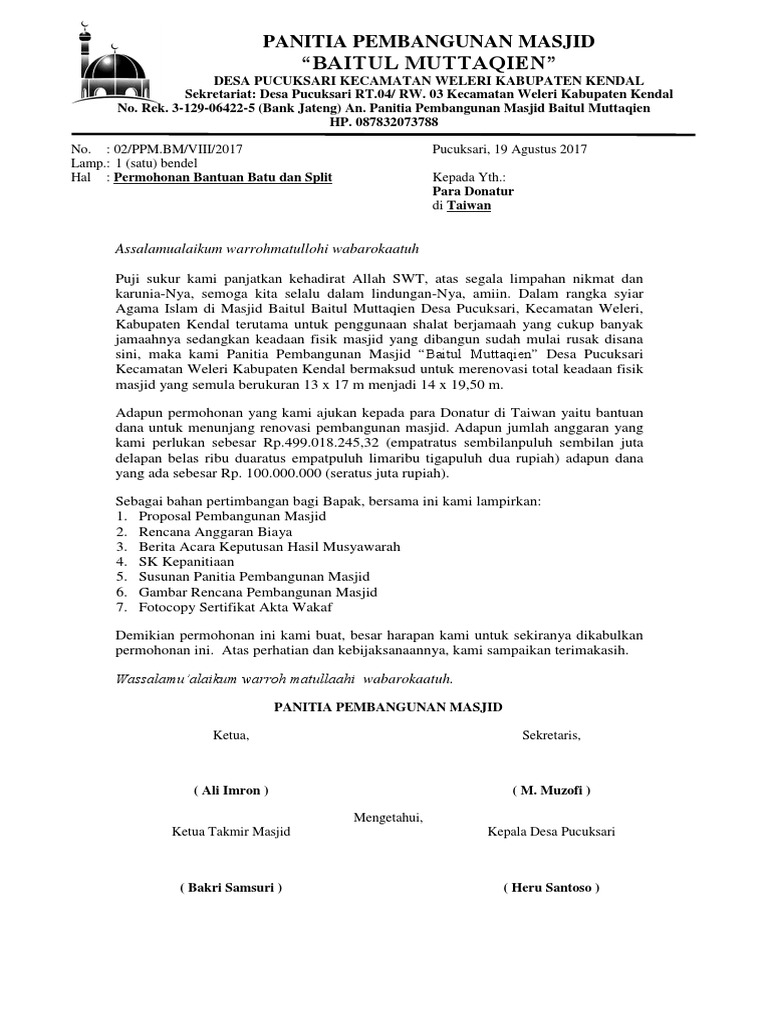 Contoh Surat Permohonan Dana Untuk Pembangunan Masjid.
