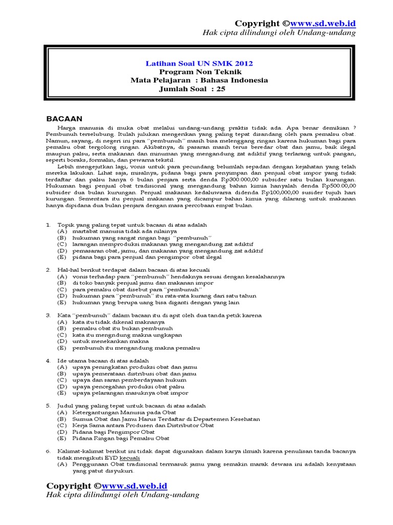 Latihan Soal Un Bahasa Indonesia. Try out un online ipa kelas vi sd. Untuk mengunduh file gunakan tombol download dibawah ini. Soal ujian sekolah bahasa indonesia smp. Contoh soal latihan usbn bahasa indonesia sd ini juga merupakan kumpulan materi pelajaran bahasa indonesia sd yang disusun dalam bentuk soal latihan. Soal ini bisa sobat kerjakan melalui media apa saja yang memungkinkan, online pun juga bisa mengingat admin sudah memberikan keseluruhannya di artikel ini. Prediksi soal usbn bahasa indonesia kelas vi sd 93082 x. Latihan soal un bahasa indonesia 2. Hai sobat, disini kembali lagi dengan centralpendidikan.com.di postingan kali ini admin akan membagikan latihan soal un bahasa indonesia smk terbaru tahun pelajaran 2020/2021 disertai kunci jawaban. Kelas 12 ujian nasional 2017. Adapun soal latihan ujian sekolah bahasa indonesia adalah sebagai berikut: Latihan soal un bahasa indonesia sd 2020 dan kunci jawabannya terlengkap. Kelas 12 ujian nasional 2017 (paket 2) Soal dan jawaban yang dibahas berikut hanyalah sebagai referensi bahan belajar bagi siswa dalam menghadapi un dan unbk. Try out un online matematika kelas vi sd. Prediksi soal usbn 2019 matematika kelas vi sd 144757 x.